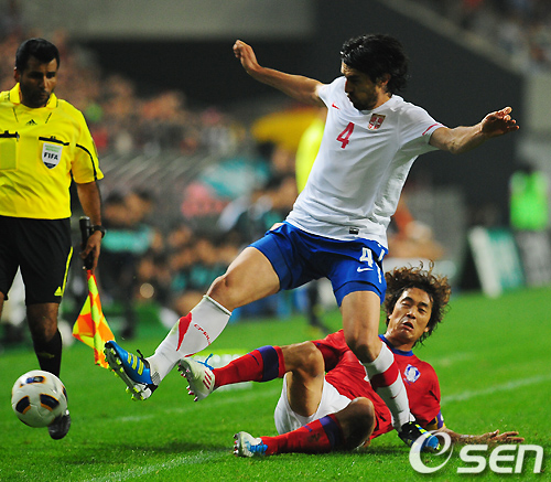 3일 오후 서울월드컵경기장에서 열린 대한민국과 세르비아의 평가전에서 전반 한국 박주영이 태클을 시도하고 있다.