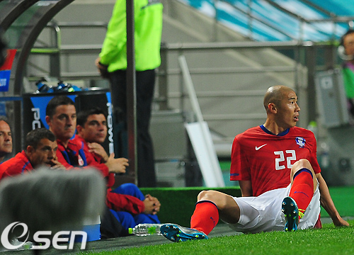 3일 오후 서울월드컵경기장에서 열린 대한민국과 세르비아의 평가전에서 전반 한국 차두리가 헤딩 시도후 균형을 잃고 세르비아 벤치근처에 앉고 있다.