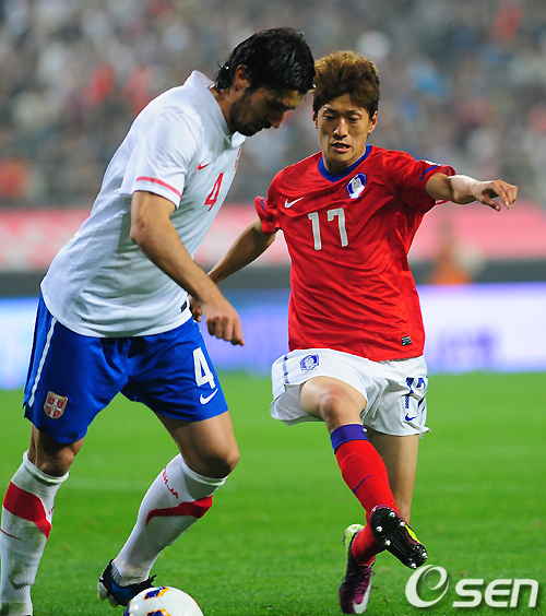 후반 한국 이청용이 세르비아 토모비치를 막아서고 있다./ rumi@osen.co.kr
