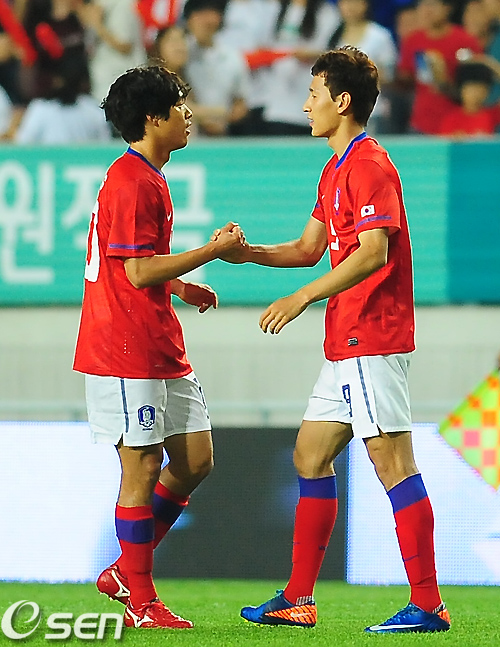 7일 오후 전주월드컵경기장서 열린 대한민국과 가나의 평가전 전반 한국 지동원이 선취 헤딩슛을 성공시킨 후 박주영과 기쁨을 나누고 있다.