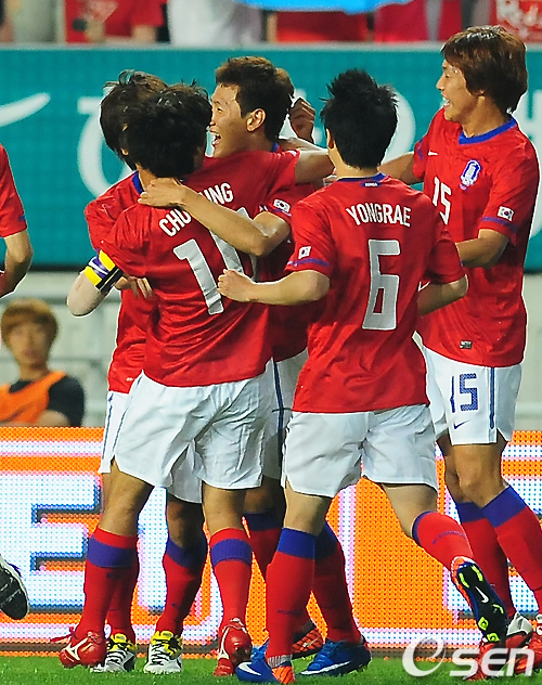 7일 오후 전주월드컵경기장서 열린 대한민국과 가나의 평가전 전반 한국 지동원이 선취 헤딩골을 성공시킨 후 기뻐하고 있다.