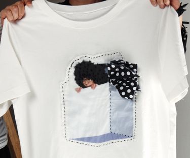 티셔츠에는 박스 안에 들어가 있는 김태호 PD가 밖으로 얼굴을 빼꼼 내밀며 소심한 모습을 보이고 있다.