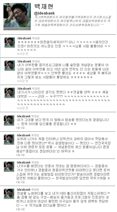 백재현은 지난 7일 오후 자신의 트위터에 "나에 대한 기사가 나리라곤 생각도 못했다. 댓글들 대박. 제일 대박은 근데 누구?"라며 "내가 아부한들 음악프로그램에 나를 쓸 만큼 개념 없는 분들이 아닌데 설마 아부였을 라고 10년 넘게 연락도 안 드린 분들께 난데없이 아부였을까. 안부이면 몰라도. 세상을 꼭 삐뚤어지게 그렇게 보는 사람들이 불쌍하오"라는 글을 올리며 자신을 비난한 네티즌들에 일침을 놓았다.