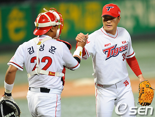 경기종료 후 KIA 유동훈 마무리 투수와 김상훈 포수가 승리의 기쁨을 나누고 있다 /soul1014@osen.co.kr