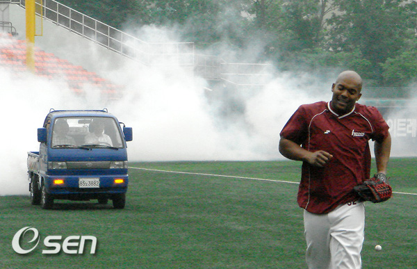 "왜 하필 선수들 훈련하는데 소독이냐…"는 주변의 말이 나오는 가운데 때마침 좌측 폴대에서 우측 폴대로 뛰던 알드리지는 소독차가 내야 쪽으로 가는 것을 보고 안심했다.