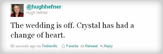 이 같은 소식이 언론을 통해 공개되자 헤프너는 자신의 마이크로 블로그 트위터에 “결혼식이 취소됐다. 해리스가 마음을 바꿨다”는 글을 게재, 보도가 사실임을 암시했다.