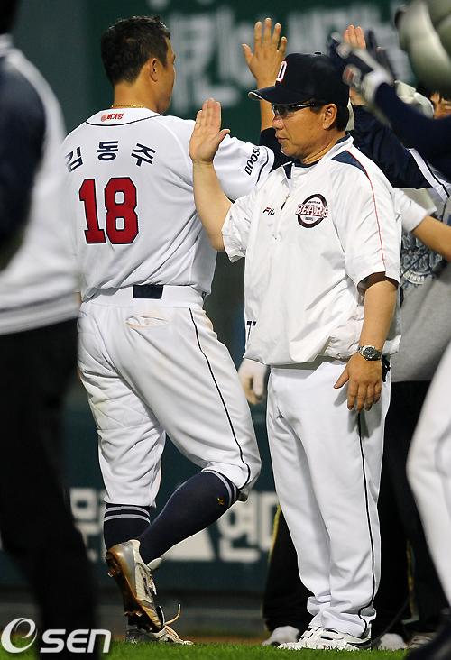경기후 승리한 두산 김광수 감독대행과 김동주과 하이파이브를 하고 있다. /jpnews@osen.co.kr