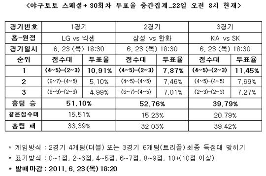 2011 프로야구 3경기 대상 야구토토 스페셜+ 30회차 투표율 중간집계