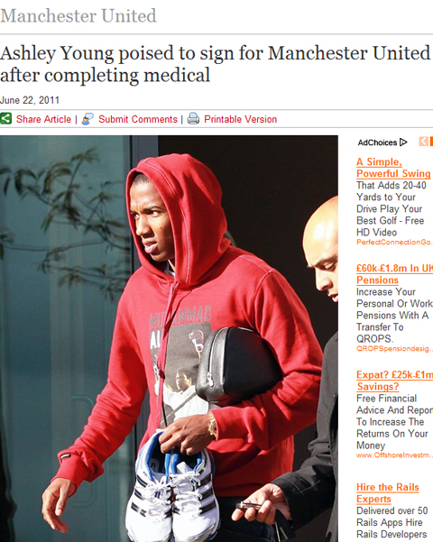 지난 13일(이하 한국시간) 필 존스(19)의 영입을 발표했던 맨유가 또 하나의 계약 성사에 임박했다. 그 대상은 잉글랜드 대표팀의 윙어이자 아스톤 빌라의 주축 선수 애슐리 영(26)이다. 영은 22일 메디컬 테스트를 받기 위해 맨유의 캐링턴 훈련장에 모습을 나타냈다.