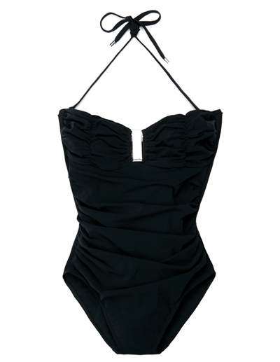 심플한 듯 보이지만, 섹시한 뒤태를 드러내는 원피스 수영복은 비키니를 입는 것이 부담스러운 여자들에게 좋은 대안이 되어준다. 모던함을 풍기는 블랙컬러의 스윔웨어는 밋밋한 실루엣에 셔링디테일이 포인트가 되어, 스타일리시하게 연출하기도 그만이다.