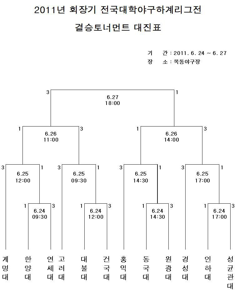 지난 8일부터 시작된 2011 회장기 전국대학야구 하계리그전이 조별 예선리그를 마치고 오는 24일 오전 9시 30분 목동야구장에서 한양대-연세대 경기를 시작으로 12강 결승토너먼트에 들어간다.