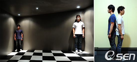 2층 포토존에서 전시회 운영 스태프가 패러디 작품을 이용해 재미있게 사진 찍는 법을 연출하고 있다. 실제 키가 비슷한 두 사람도 착시의 방에서 사진을 찍으면 체구가 확연히 다르게 보인다.