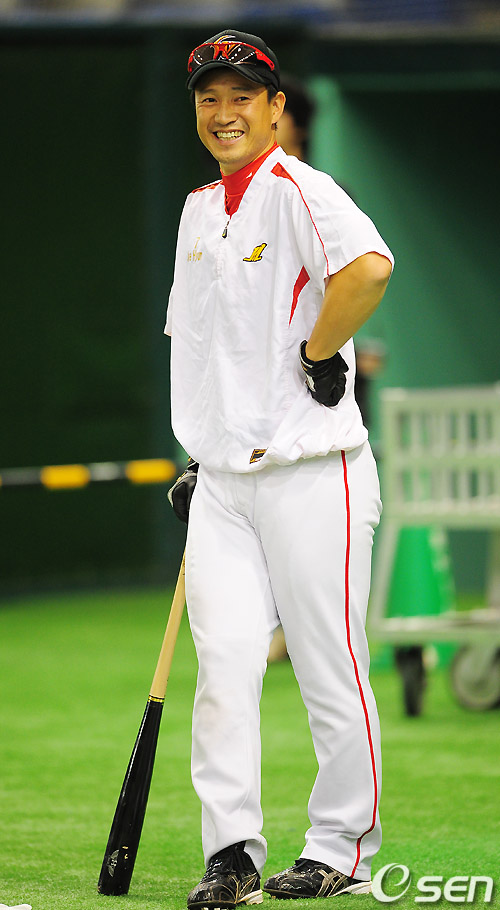 하얀 캐주얼 여름 정장에 청바지를 차려입은 김재현이었다. 선글라스 자국이 살짝 비쳐져 미국 코치 연수생활을 가늠할 수 있었다. 또 카리스마 넘치던 선수 시절보다 좀더 넉넉하고 잦은 환한 미소가 귀국 후 그라운드를 다시 찾은 반가움을 대변했다.
