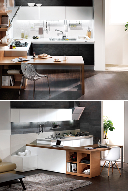 둘 다 편의성을 높이고, 부엌이 단순히 요리만 하는 공간이 아닌 조리대나 작업대로 활용할 수 있는 아일랜드와 빌트 형(내장형 붙박이) 기기장, 장식장의 기능을 동시에 겸하는 낮은 장을 제안한 것도 눈에 띈다.