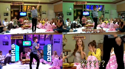 소시 멤버들과 슈주 멤버들도의 그의 이런 춤은 처음 본다는 듯 경악을 금치 못했고, 자막에도 '자막으로 설명이 힘든..'이라는 문구가 등장해 웃음을 유발했다.