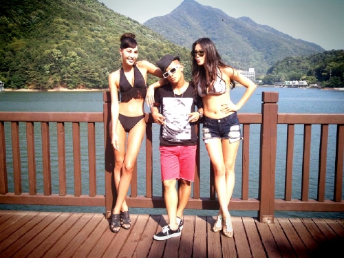 이번 사진은 마이티마우스의 신곡 뮤직비디오 현장에서 한 스태프에 의해 촬영된 것으로 뮤직비디오에 출연하는 8등신 여자 모델과의 기념 촬영 컷이다.