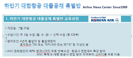 높은 경쟁률의 대한항공 대졸공채는 면접의 비중이 커 면접준비의 중요성은 이루 말 할 수 없다. 오랜 전통을 자랑하는 ANC지상직학원(www.iloveanc.com)은 동방항공, 베트남항공, 홍콩항공 등의 채용대행을 담당하며 쌓은 채용에 대한 노하우를 바탕으로 대한항공대졸공채 과정을 개설했다.
