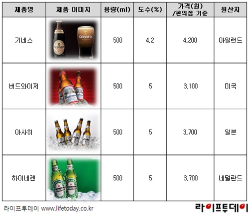 버드와이저, 아사이, 하이네켄은 모두 도수 5%다. 가격에서는 조금 차이를 보이는데 버드와이저가 3,100원으로 가장 저렴(?)하고, 아사히와 하이네켄은 동일한 3,700원이다. 국산맥주가 2,450원임을 감안하면 고가다. 더욱이 기네스는 4,200원으로 흑맥주 특유의 초고가를 자랑한다. 가격에 구애받지 않고 자신이 선호하는 맛만으로 맥주를 선택하는 소비자들이 선택하면 되겠다.