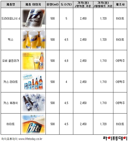 500ml 6개 제품 모두 편의점 가격은 2,450원으로 똑같았다. 대형마트 기준(*서울시 강동구 위치)으로는 10원의 가격 차이가 났는데 하이트 제품인 드라이피니시d와 맥스 • 하이트는 1,720원에, OB맥주 제품인 오비 골든라거와 카스 라이트 • 카스 후레쉬는 1,710원에 판매되고 있었다. 한 마디로 OB제품이 10원 더 쌌다!