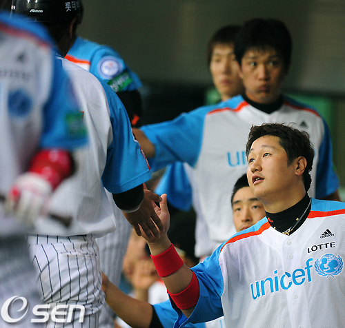 [OSEN=사직,지형준기자] 30일 오후 부산 사직구장에서 열린 '2011 롯데카드 프로야구' 롯데 자이언츠와 KIA 타이거즈의 경기, 2회말 무사 1,3루에서 롯데 강민호가 조성환의 내야땅볼에 홈을 밟고 더그아웃에서 이대호와 하이파이브를 하고 있다. /jpnews@osen.co.kr