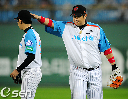 [OSEN=사직,지형준기자] 30일 오후 부산 사직구장에서 열린 '2011 롯데카드 프로야구' 롯데 자이언츠와 KIA 타이거즈의 경기, 6회초 2사 1,2루에서 롯데 고원준이 KIA 김상현을 투수앞 땅볼로 처리하고 이대호의 격려를 받고 있다. /jpnews@osen.co.kr