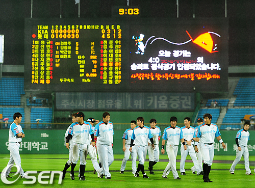 [OSEN=사직,지형준기자] 롯데가 30일 사직구장에서 열린 2011 롯데카드 프로야구 KIA와의 홈경기에서 선발 고원준이 7이닝 무실점 완봉역투와 손아섭의 2타점 3루타를 앞세워 4-0, 강우콜드 승리를 거두었다. 롯데는 4연패 탈출의 기쁨을 누렸고 KIA는 3연승에서 마감했다.