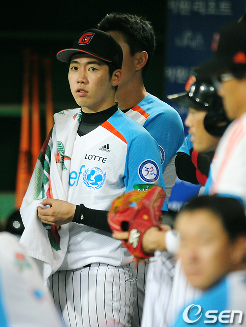 7회초 우천으로 경기가 중단되자 롯데 선발투수 고원준이 더그아웃에서 그라운드를 바라보고 있다. /jpnews@osen.co.kr