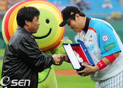 경기에 앞서 롯데 이대호가 2000루타를 기념해 허운 KBO 경기 운영위원에게 트로피를 건네 받고 있다. /jpnews@osen.co.kr