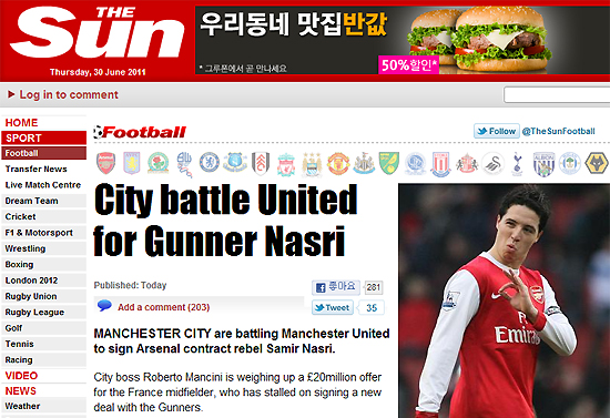 사미르 나스리(24, 아스날)이 맨체스터 유나이티드(이하 맨유)와 맨체스터 시티(이하 맨시티)의 영입 리스트에 동시에 올랐다.