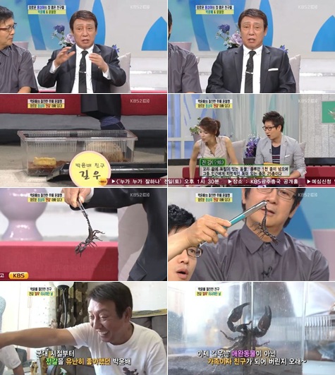 1일 오전 KBS 2TV '여유만만'에 출연한 박윤배가 자신의 친구(?)로 전갈 '길우'를 소개한 것. 스튜디오에 함께 출연한 배우 윤철형과 MC들은 일동 경악했다.