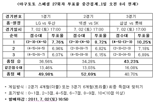 2011 프로야구 3경기 대상 야구토토 스페셜 27회차 투표율 중간집계