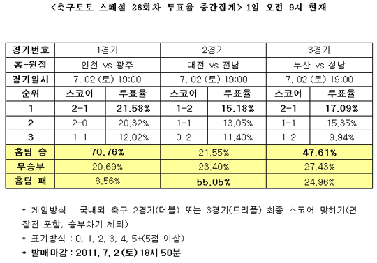 주말 K-리그 3경기 대상 축구토토 스페셜 26회차 투표율 중간집계 결과