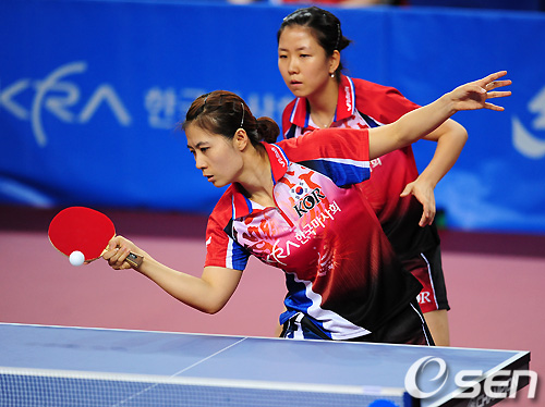 여자복식 1라운드에서 대한민국 김경아와 박미영이 대만 선수의 공격을 받아내고 있다. / sunday@osen.co.kr