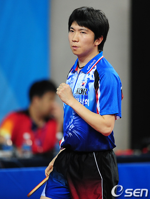 남자복식 1라운드에서 대한민국 유승민이 공격을 성공하고 환호하고 있다. / sunday@osen.co.kr