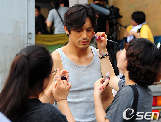촬영전 오지호가 분장을 받고 있다./ rumi@osen.co.kr