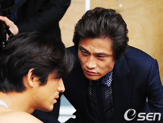 촬영중 박정학이 오지호의 머리에 총을 겨누고 있다./ rumi@osen.co.kr