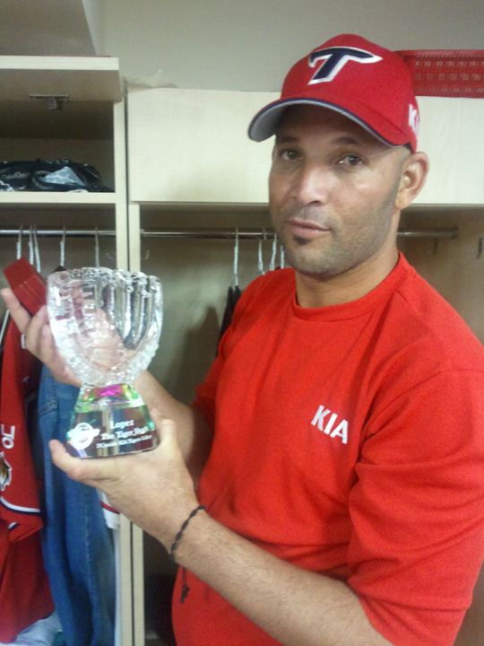 1일 광주구장. 한화와 홈경기를 앞둔 KIA 선수단에 선물 꾸러미가 배달됐다. 디시인사이드 'KIA 타이거즈 갤러리' 회원들이 로페즈에게 특별 선물을 전한 것이다. 로페즈의 사진 하나 하나가 모자이크 처리된 액자와 크리스탈로 만들어진 글러브 그리고 캐릭터 앨범 등을 선물로 제공했다. 이와 함께 간식 도시락 60세트도 배달됐다. 팬들의 정성 가득한 선물 꾸러기를 받은 로페즈는 연신 싱긍벙글했다고.
