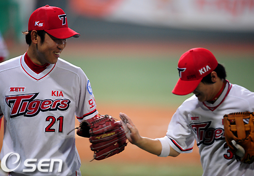 [OSEN=광주,지형준기자] 1일 오후 광주구장에서 열린 '2011 롯데카드 프로야구' KIA 타이거즈와 한화 이글스의 경기, 4회초 수비를 마친 KIA 윤석민이 김선빈과 하이파이브를 하고 있다. 김선빈은 4회초 1사에서 한화 가르시아의 타구를 몸을 날려 잡아냈다. /jpnews@osen.co.kr
