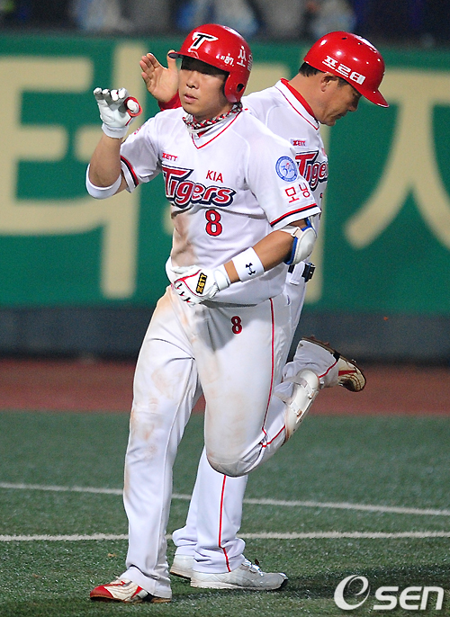 [OSEN=광주,지형준기자] 1일 오후 광주구장에서 열린 '2011 롯데카드 프로야구' KIA 타이거즈와 한화 이글스의 경기, 6회말1사 2루에서 KIA 안치홍이 투런 홈런을 날리고 백인호 코치와 하이파이브를 하며 그라운드를 돌고 있다. /jpnews@osen.co.kr