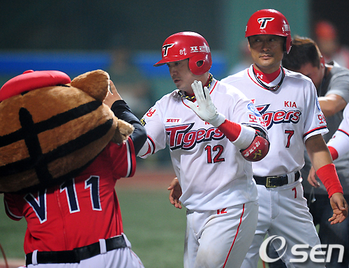 [OSEN=광주,지형준기자] 1일 오후 광주구장에서 열린 '2011 롯데카드 프로야구' KIA 타이거즈와 한화 이글스의 경기, 7회말 무사 1,2루에서 KIA 차일목이 한화 유창식을 상대로 스리런 홈런을 날리고 홈을 밟으며 마스코트와 하이파이브를 하고 있다. /jpnews@osen.co.kr