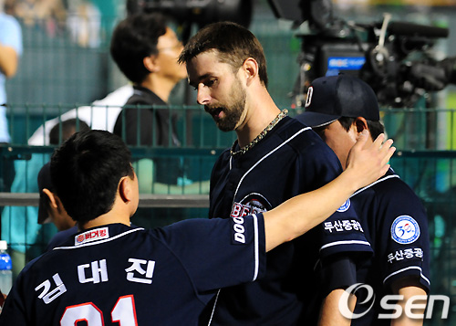 경기후 두산 니퍼트가 덕아웃에서 동료들의 축하를 받고 있다. / sunday@osen.co.kr
