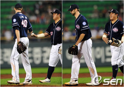 경기후 두산 최준석이 니퍼트에게 완봉 기념으로 공을 줬지만 니퍼트가 받는 척 하며 거절하는 모습에 폭소를 터뜨리고 있다. / sunday@osen.co.kr