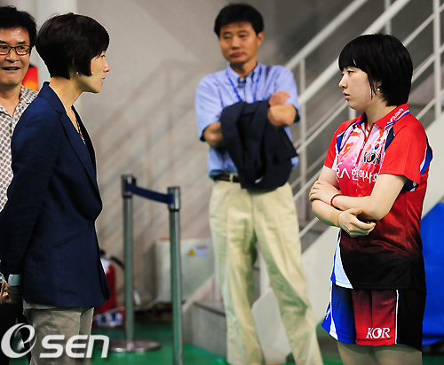 얼짱 탁구선수 서효원이 경기 전 현정화에게 지도를 받고 있다. / rumi@osen.co.kr