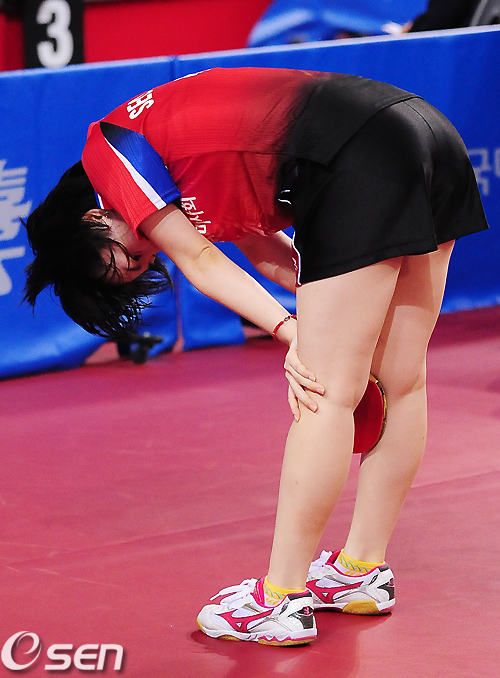 여자단식 2라운드에서 대한민국 서효원이 자신의 공격이 실패하자 아쉬워하고 있다. / rumi@osen.co.kr