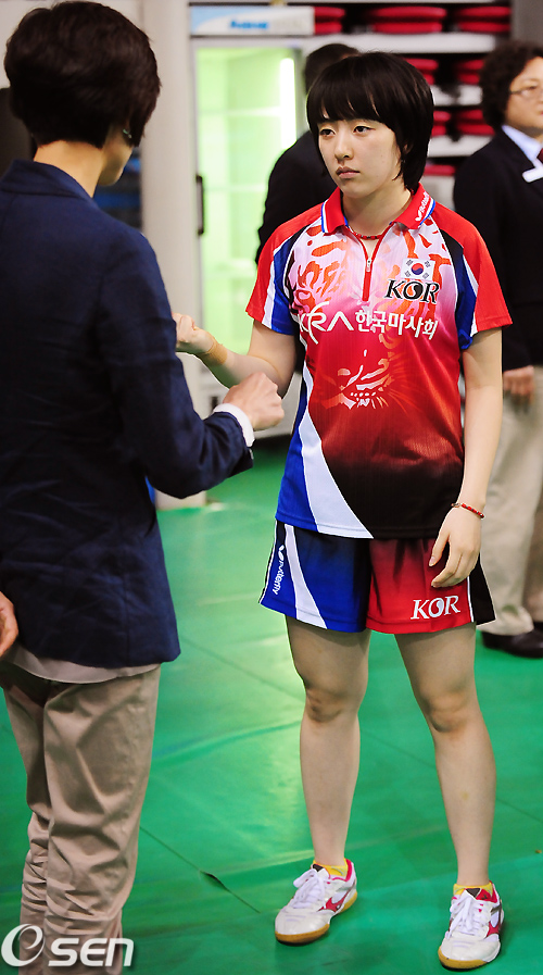 얼짱 탁구선수 서효원이 경기 전 현정화 감독에게 지도를 받고 있다. / rumi@osen.co.kr