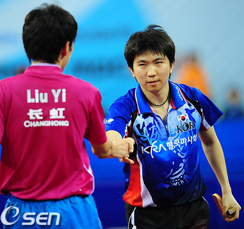 남자단식 2라운드에서 대한민국 유승민이 중국 리우위에게 4-0완승을 거두고 악수를 나누고 있다. / rumi@osen.co.kr