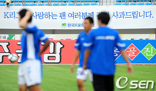 2일 오후 상주시민운동장에서 열린 '현대오일뱅크 K리그 2011' 16라운드 상주 상무와 대구 FC의 경기에 앞서 승부조작 후폭풍으로 분위기가 어수선한 가운데 한국프로축구연맹의 'K리그를 사랑하는 팬 여러분께 깊이 사과드립니다' 라는 현수막이 걸려 있다. /jpnews@osen.co.kr