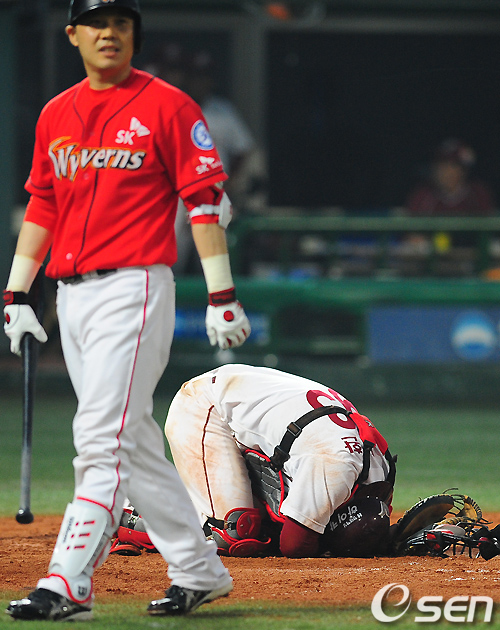 8회초 1사 주자 없는 상황에서 넥센 허도환 포수가 SK이호준에 이어 바로 박진만의 파울타구를 몸에 맞고 엎드려 고통을 호소하고 있다.