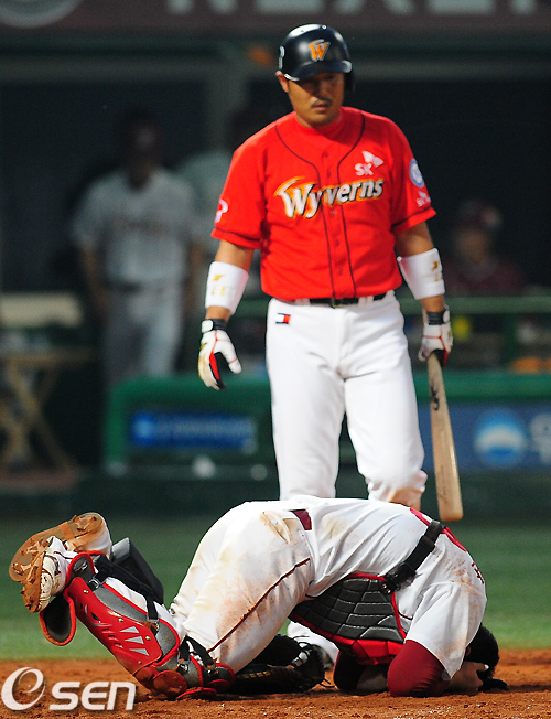 4회초 2사 주자 1,3루 SK 김강민의 파울타구가 넥센 허도환 포수의 급소쪽에 맞고 튕겨나오고 있다.