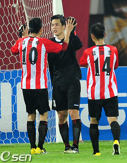 후반 상주 권순태 골키퍼가 퇴장당하고 교체된 미드필더 곽철호가 대구 끼리노의 페널티킥을 막아내고 김정우와 기뻐하고 있다. /jpnews@osen.co.kr